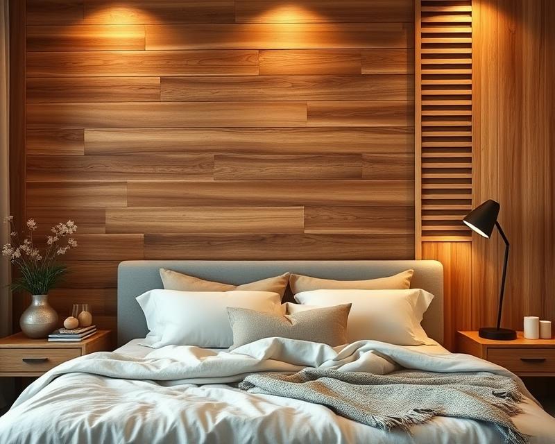 Inwestycja w dekoracyjne lamelki lub panele z litego drewna przynosi elegancję, czyniąc z nich centralny punkt w sypialni.