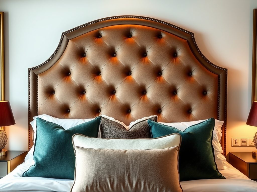 - Styl glamour: Tapicerowane zagłówki z weluru lub aksamitu w eleganckich kolorach jak granat czy czerń, z ozdobnymi guzikami i błyszczącymi detalami.